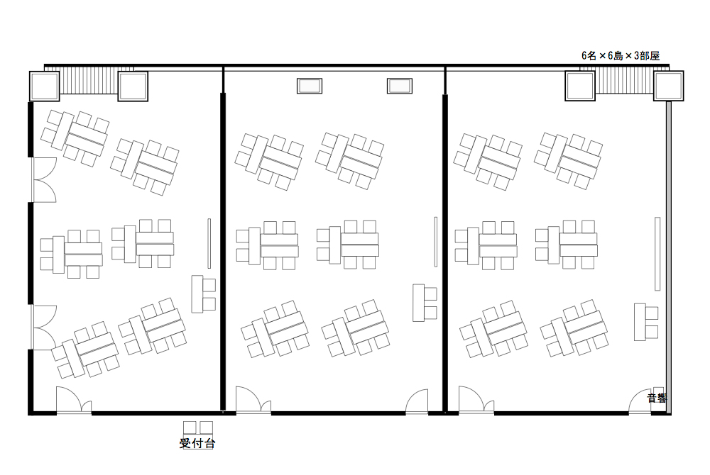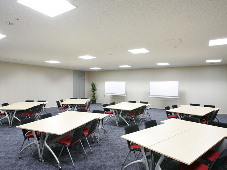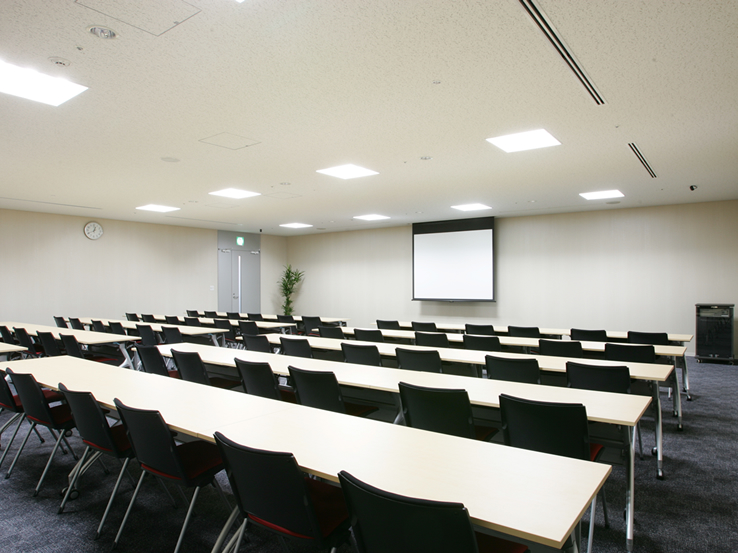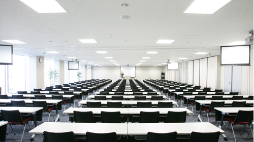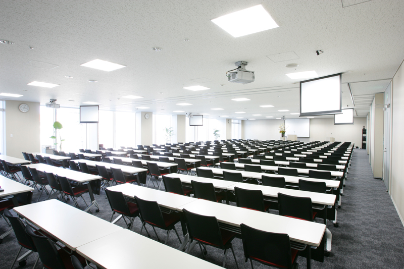 スクール形式で最大216名収容、正面には120インチスクリーンと天吊プロジェクターを備え、また更に4ヶ所のサブスクリーンにより、どの座席からもクリアーな視点が確保できます。 また、用途によって会場の3分割が可能、様々なご利用に合わせたスタイルが実現できます。