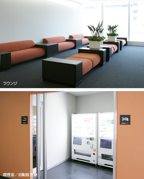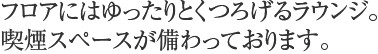 清潔感のあるスモーキングコーナーや、各種ドリンク類の自動販売機も完備しています。